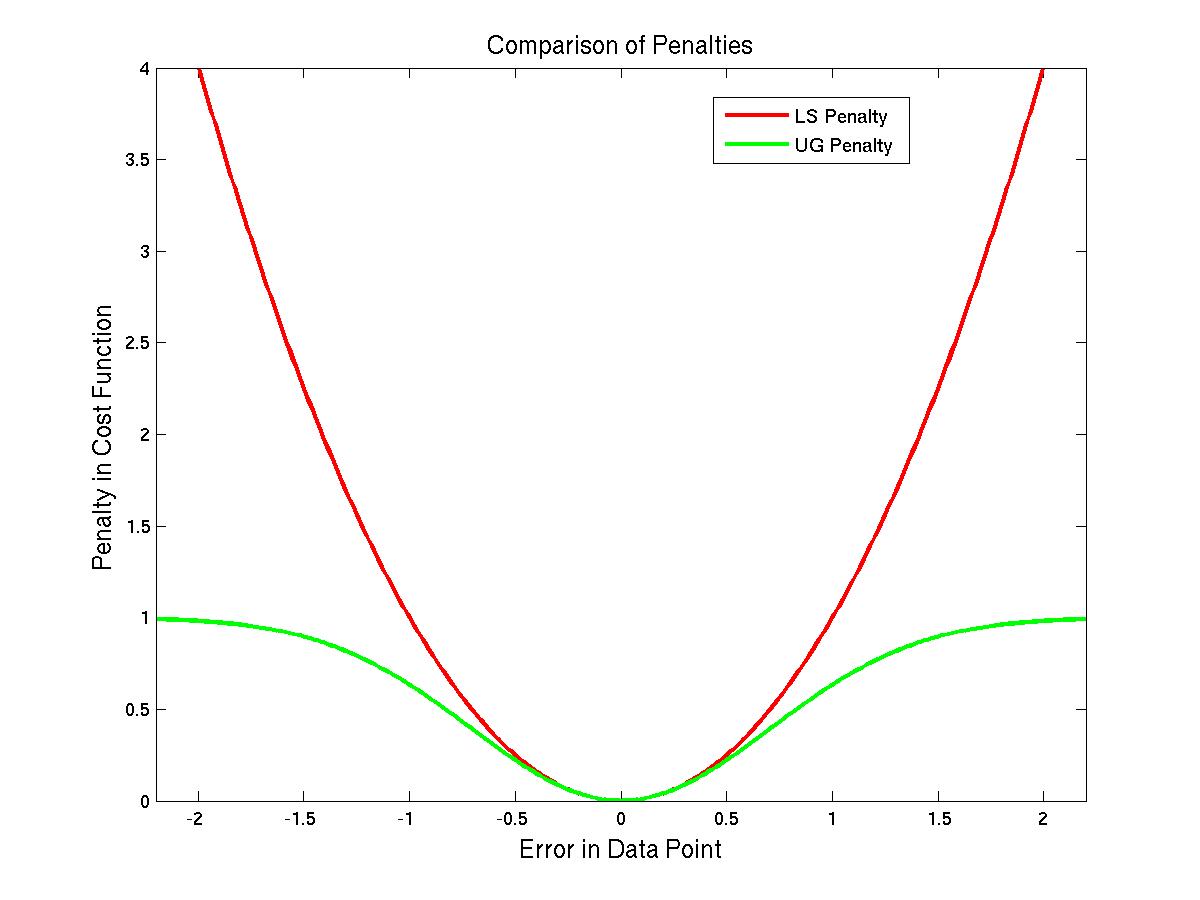 Comparison of Penalty Function for Errors Fitting Data Points (Squared Error or Upside-Down Gaussian).